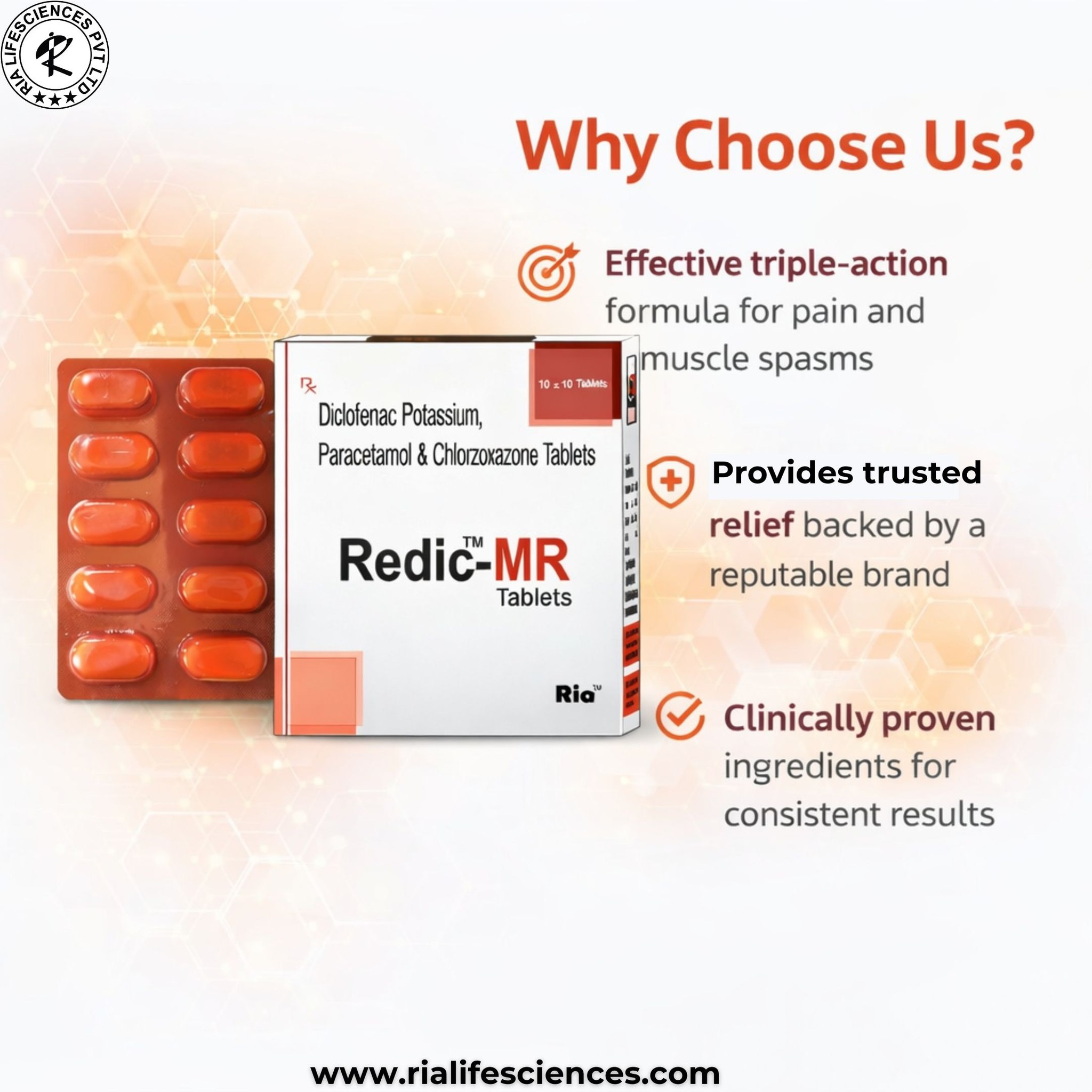 REDIC-MR is a modified-release formulation of Diclofenac, designed to provide long-lasting pain relief for individuals suffering from chronic conditions such as osteoarthritis, rheumatoid arthritis, or chronic back pain. The modified-release mechanism allows the medication to be released slowly over time, providing continuous pain management with fewer doses throughout the day. REDIC-MR works by reducing the production of prostaglandins, the chemicals responsible for inflammation, pain, and fever. This makes it particularly effective in reducing joint stiffness, swelling, and pain over an extended period. As it provides sustained relief, it is typically taken once or twice daily, depending on the doctor's recommendation. While it is generally well-tolerated, long-term use should be monitored to minimize potential side effects such as gastrointestinal irritation, ulcers, or kidney problems. It is important to follow the prescribed dosage to maximize its benefits.