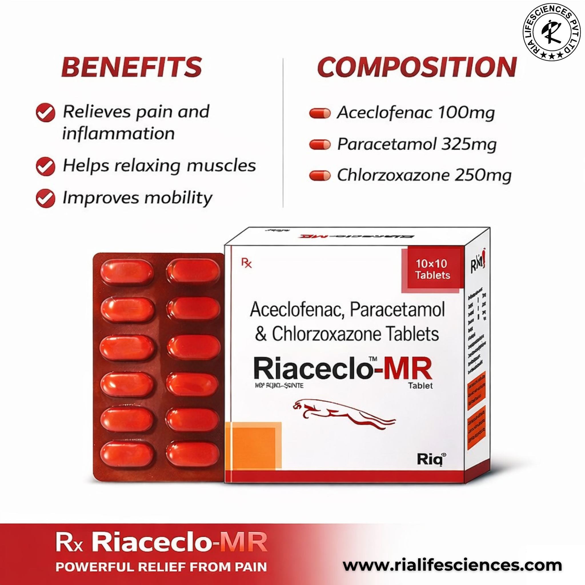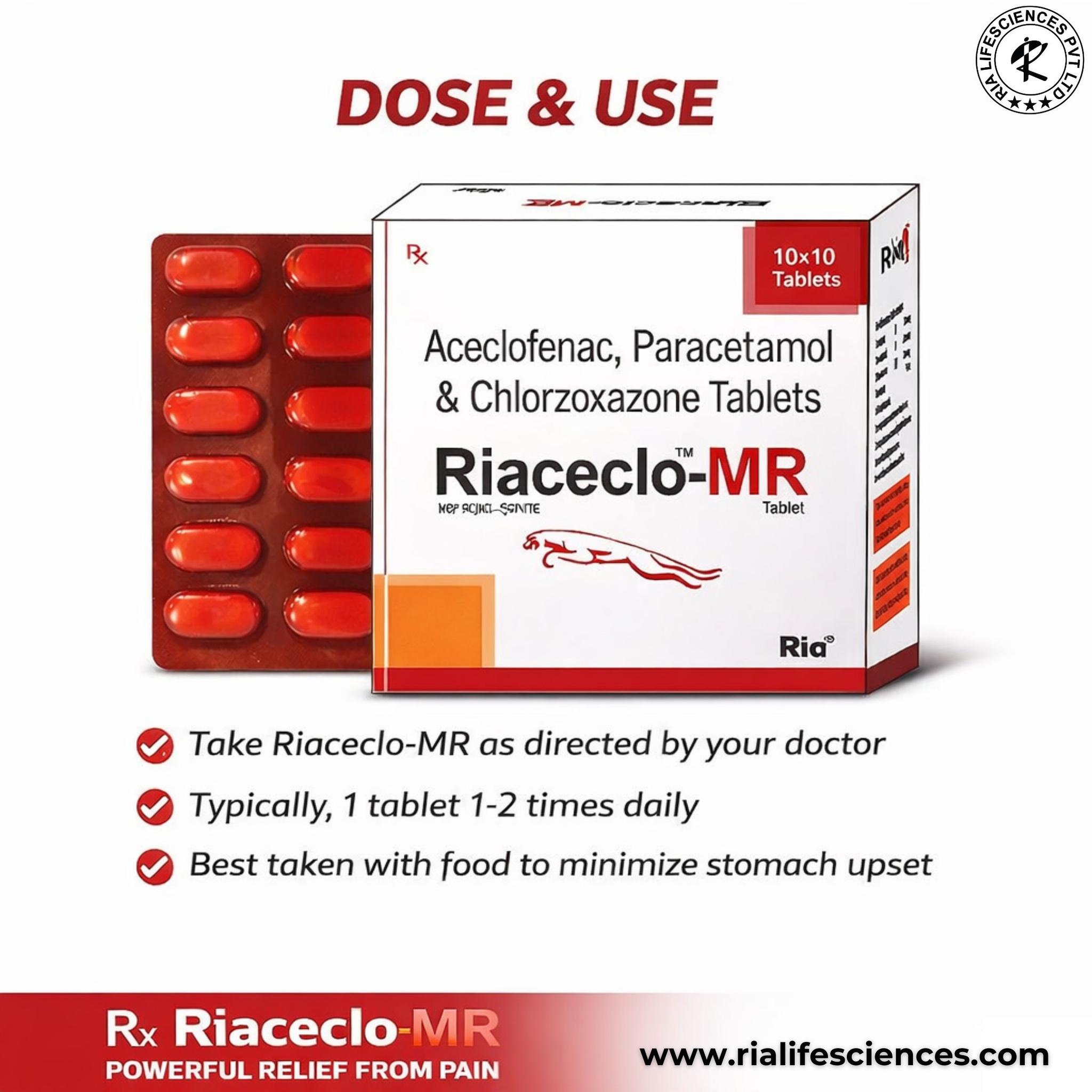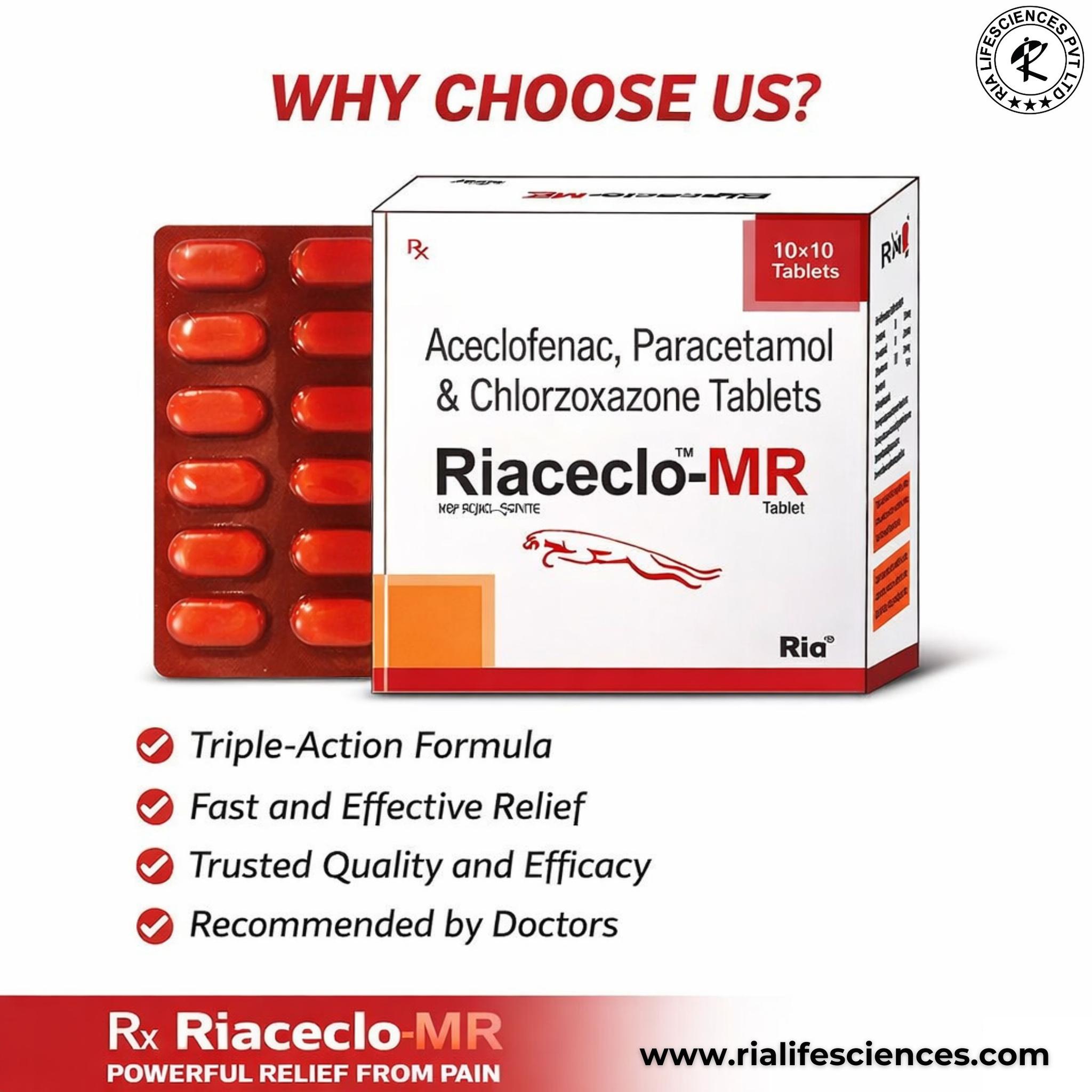 Composition: Aceclofenac 100mg +Paracetamol 325mg +Chlorzoxazone250mg TAB
