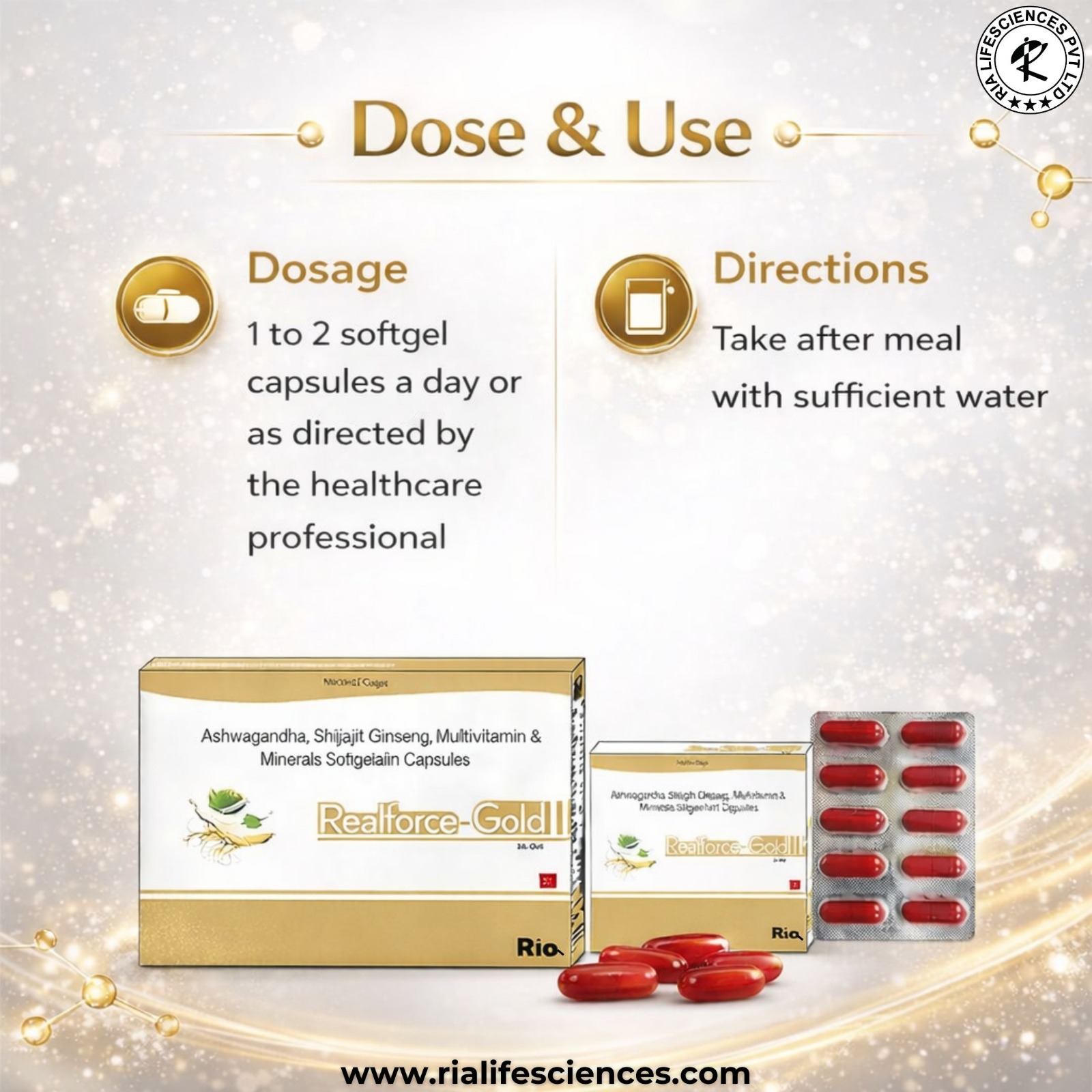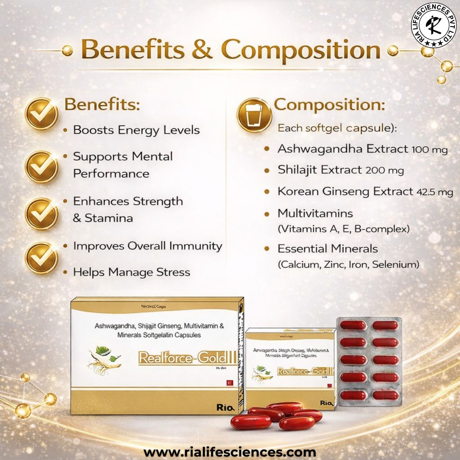 Composition: Ahwagandha, Shilajit, Ginseng, MultiVitamin & MultiMineral Softgelatin Capsule