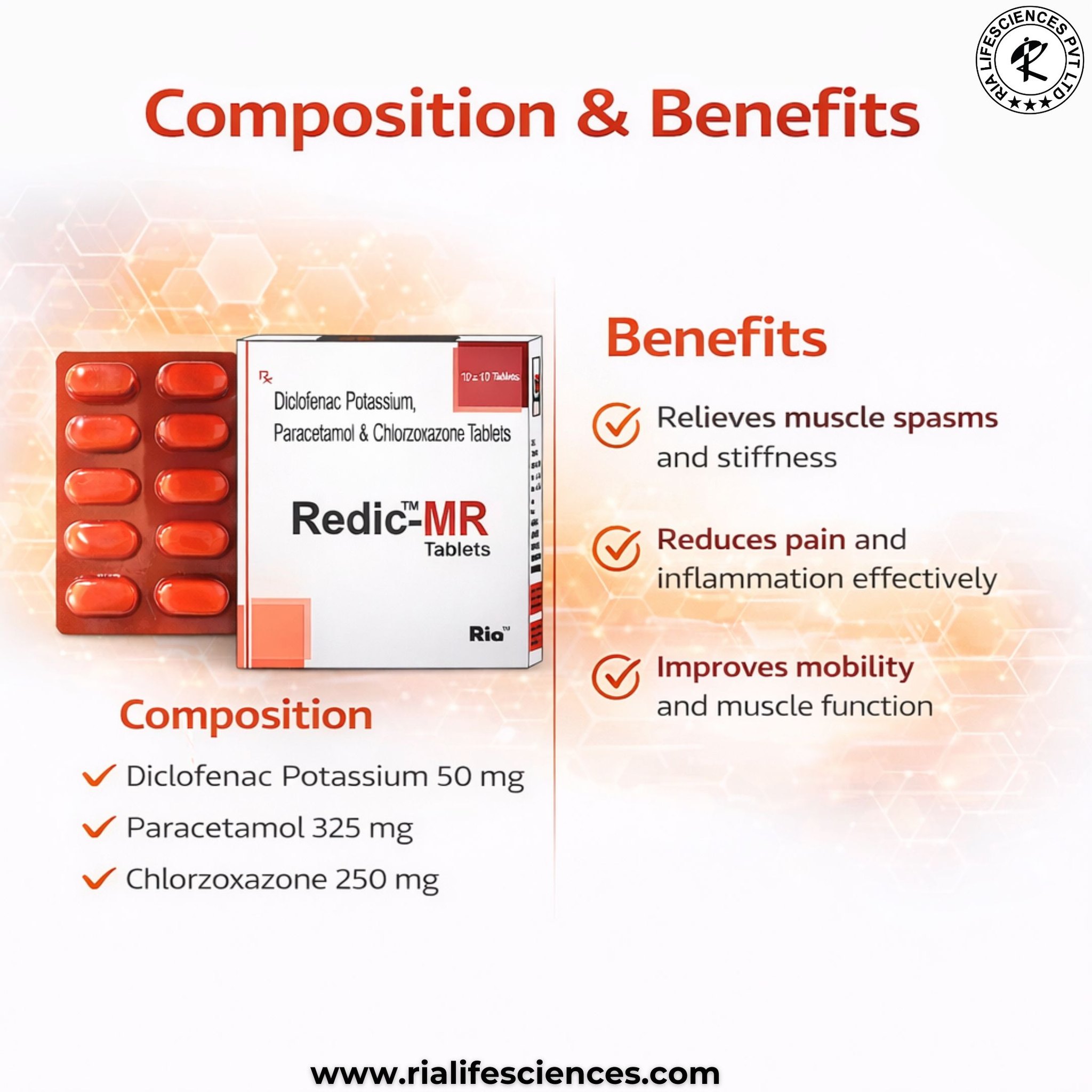 Composition: Diclofenac 50mg, Paracetamol 325mg, Chlorzoxazone 250mg